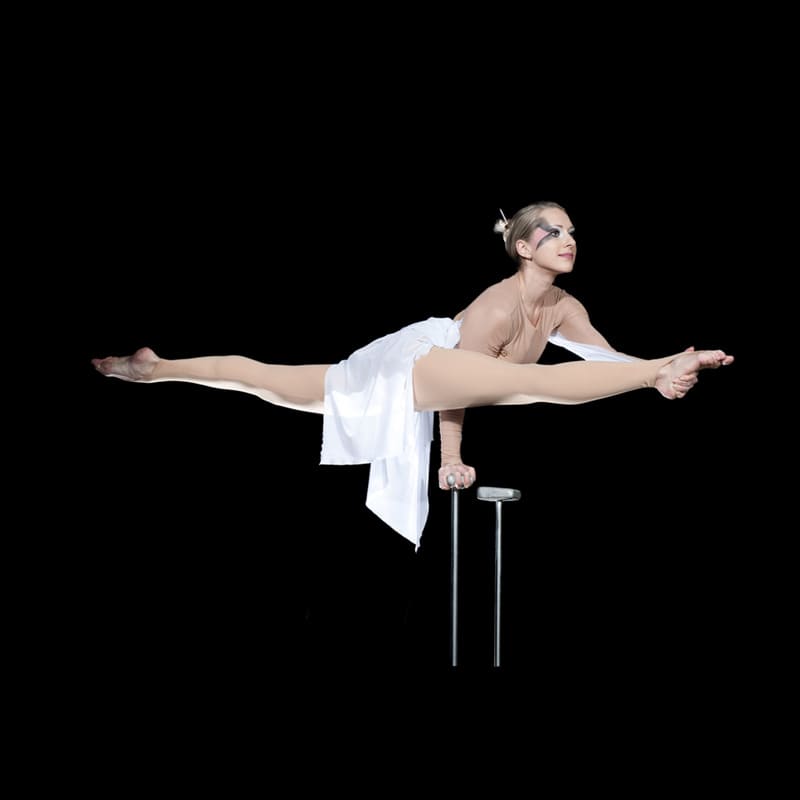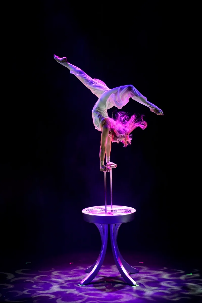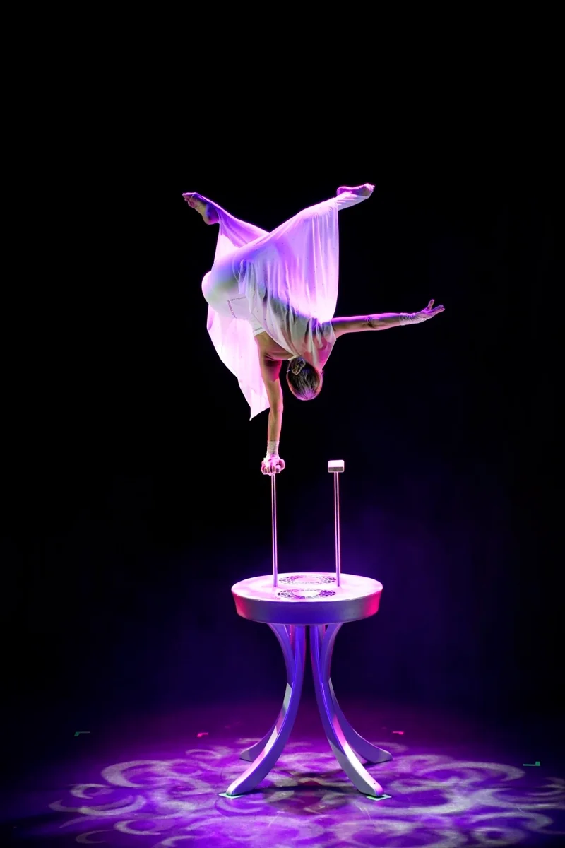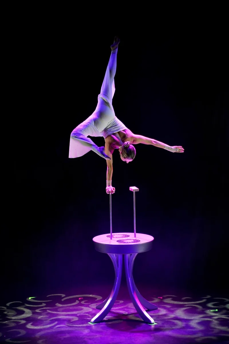 Photos from the handstand show act "Vision" with white stage costume.